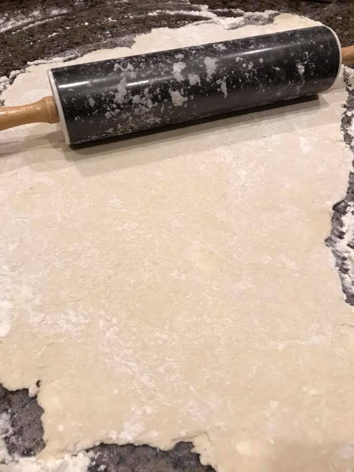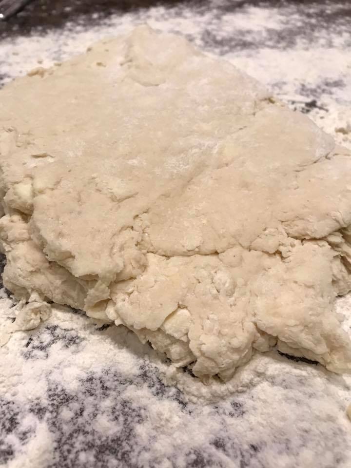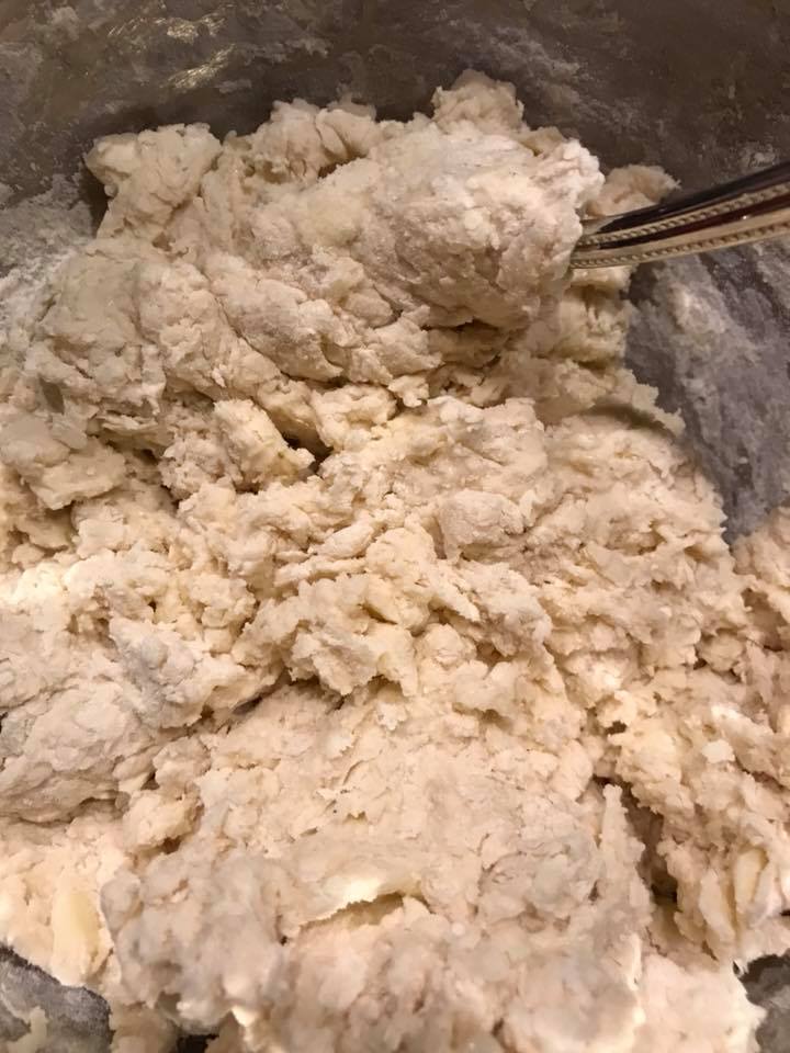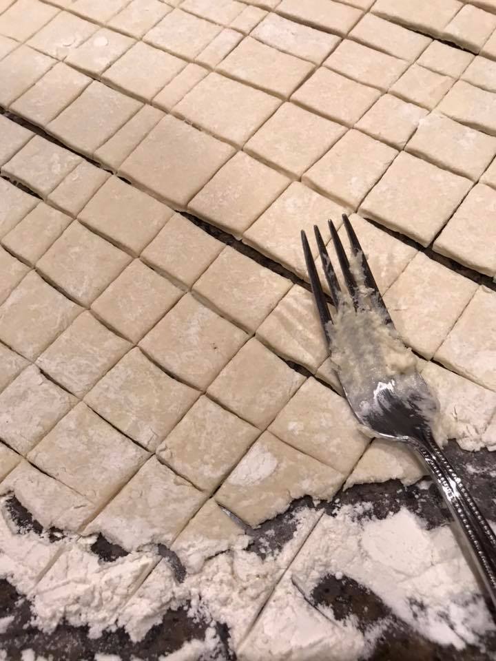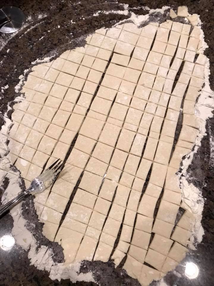 - While the veggies and broth are cooking, start the dumplings. Stir flour, baking powder, and salt. Cut in butter until crumbly. Stir in milk until a dough forms. Dust a work surface with lots of flour and place the ball of dough. Dust with plenty more flour and roll out until as thin as possible. Use a pizza cutter to slice into thin strips. Then slice at a 90° angle to form small squares. They don’t have to be uniform, but the smaller the better because they expand.