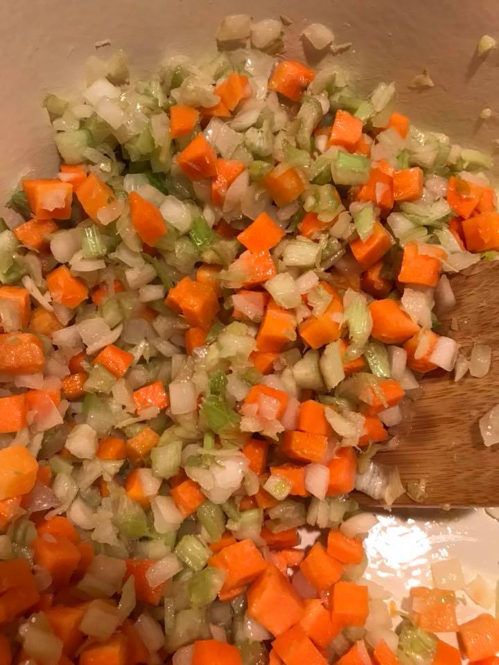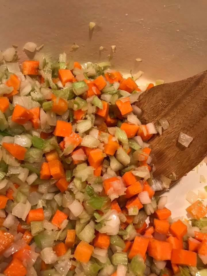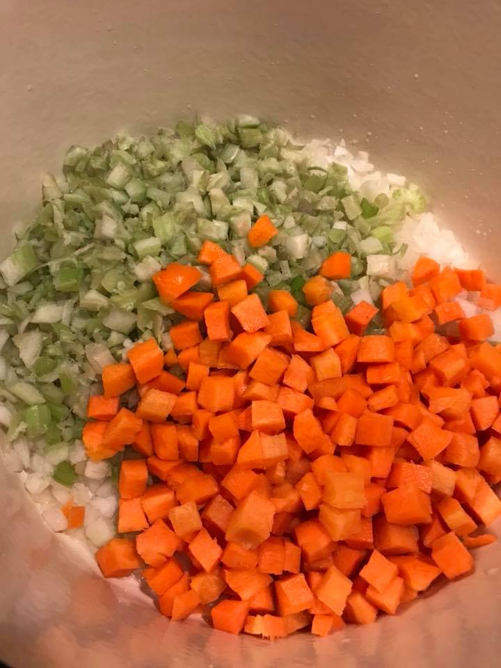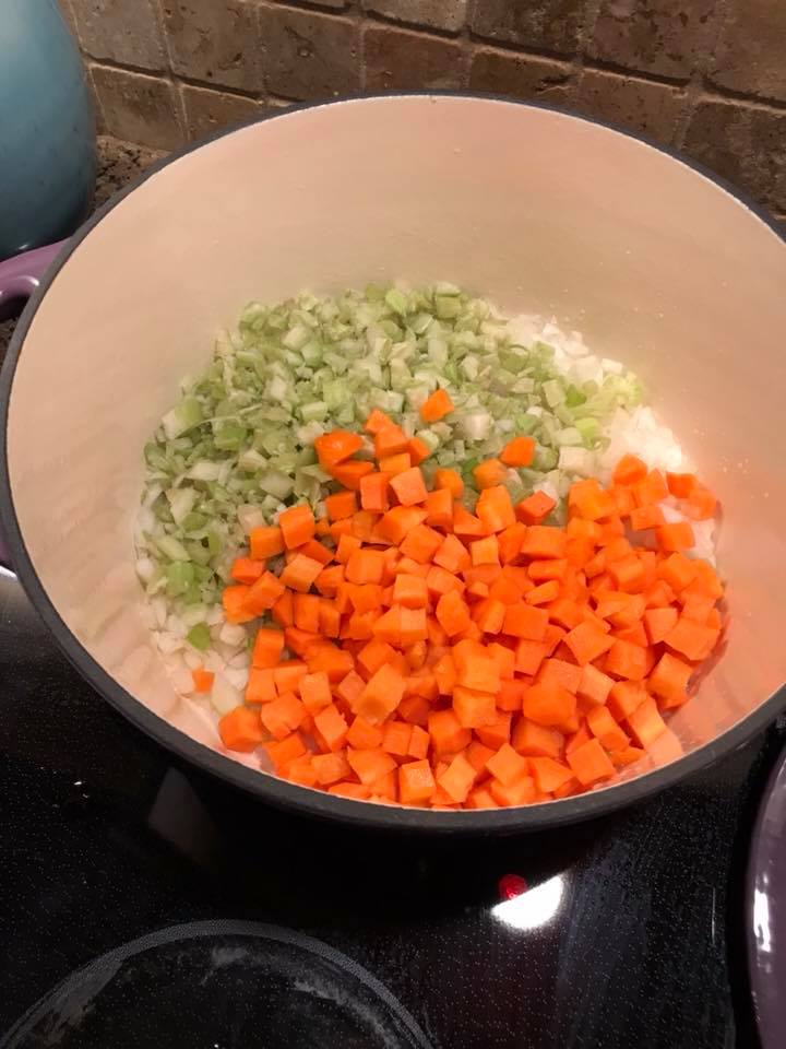 - Start the broth while the chicken is baking. I prefer a dutch oven, but any big pot will work. Heat oil and gently sauté the onion, carrot, and celery for 5 minutes. Add the chicken broth and bring to a simmer.