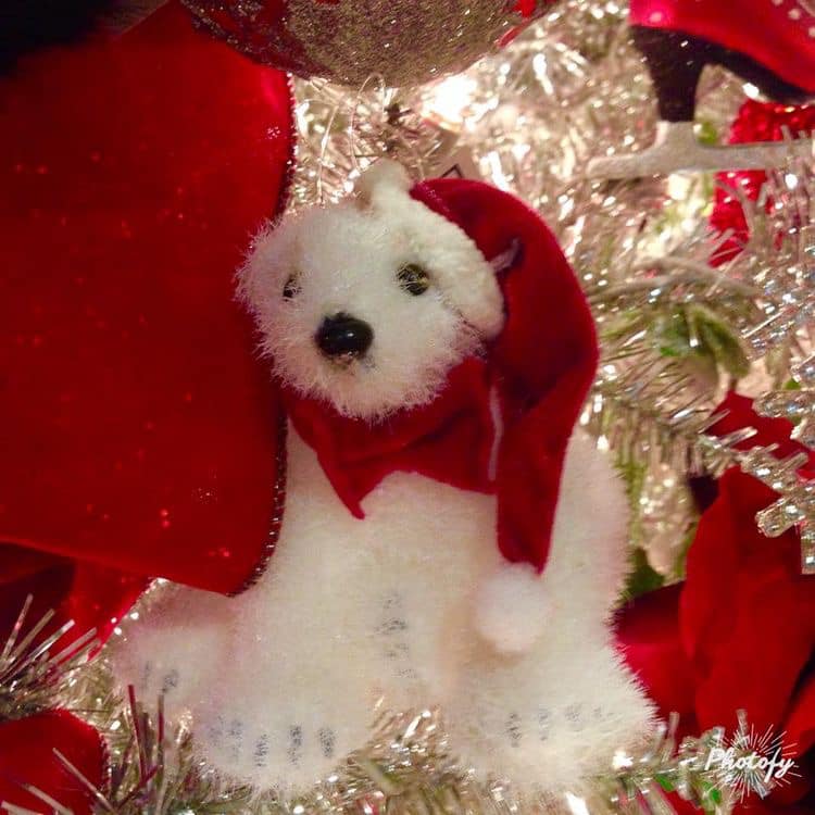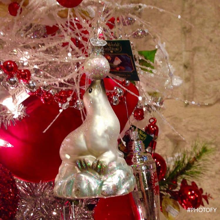 Baby, it’s cold outside! So, we wrapped our tree with red velvet ribbon and poinsettias that have just a touch of glitzy silver glitter on their edging. Next, we added flocked and iridescent florals to give that polar feel. The ball ornaments are red velvet, snowy white, and red glass.