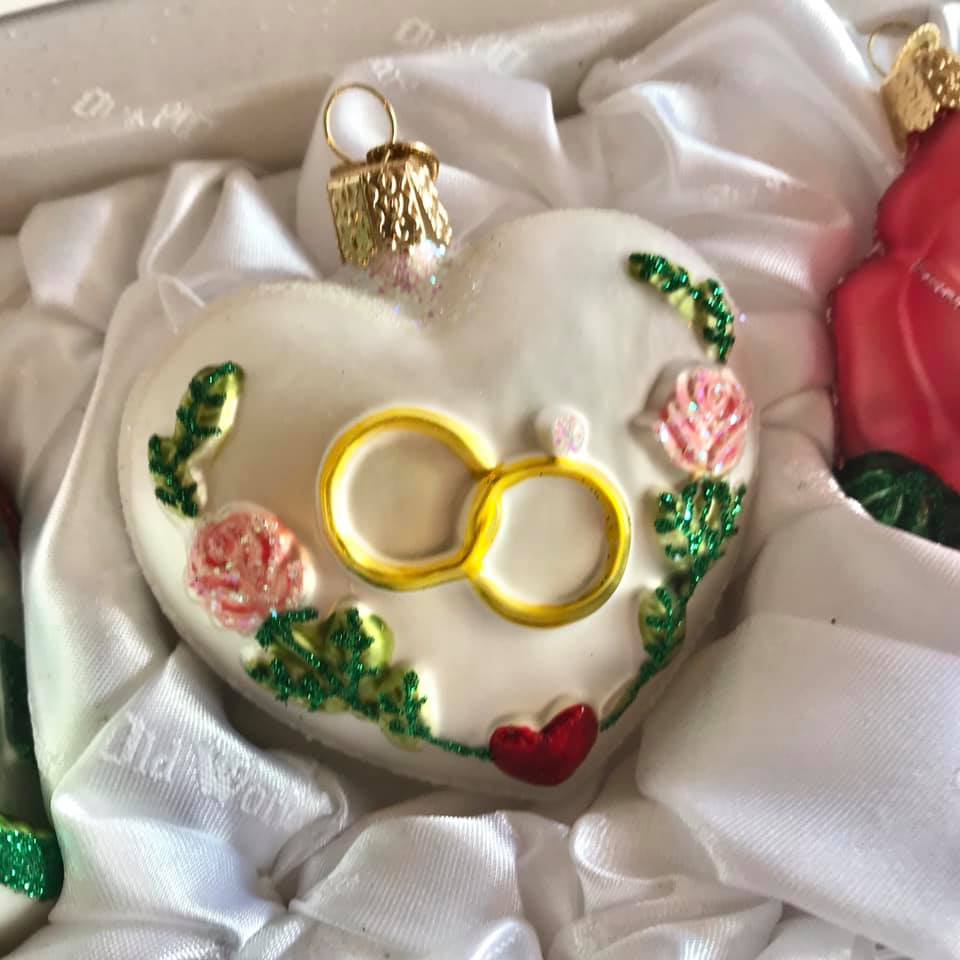 We are happy to personalize any items with smooth flat spaces for FREE! Just ask at check out! Ornaments that personalize well include the engaged ring box ornament and wedding heart ornament pictured above. We usually put the couple’s names or last name and the year. Keep in mind, the shorter the personalization, the better it looks on the item.