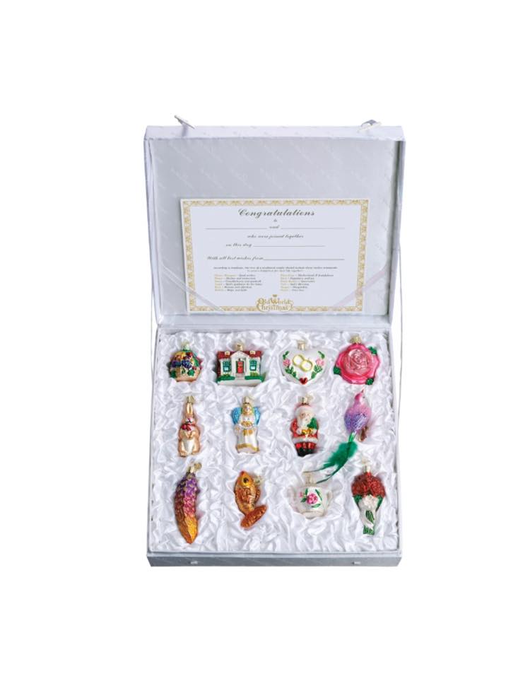 Years ago the Old World Christmas company began making a set of ornaments that ensure all the wishing bases are covered. It’s a twelve piece set in a beautiful white box, and I mailed it to my friends for their wedding gift. Now, they’re ready to decorate their first Christmas tree as elf and wife. Click the link above for a closer look or to order one for yourself.